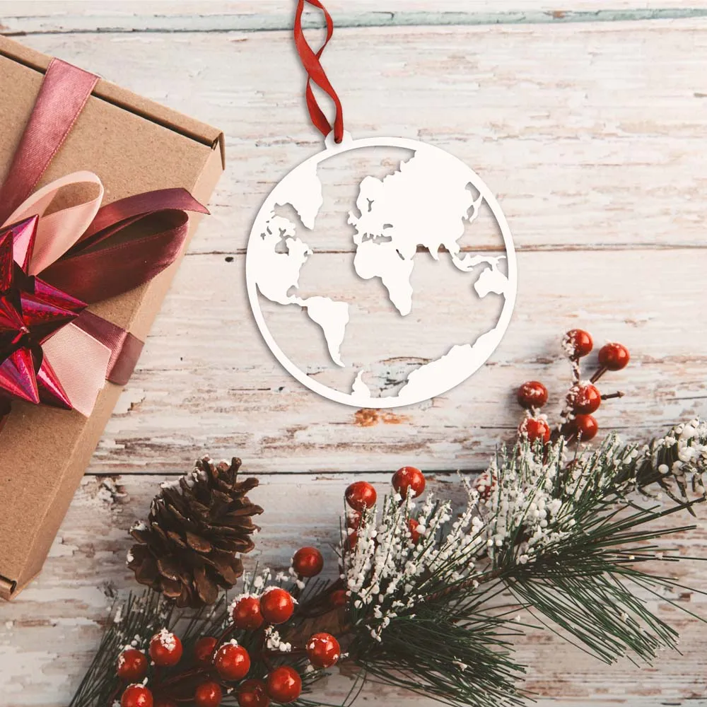 Apportez la magie du monde entier à votre sapin avec cette boule de Noël en acier laqué blanc, finement découpée pour représenter la carte du monde, parfaite pour sublimer votre décoration.