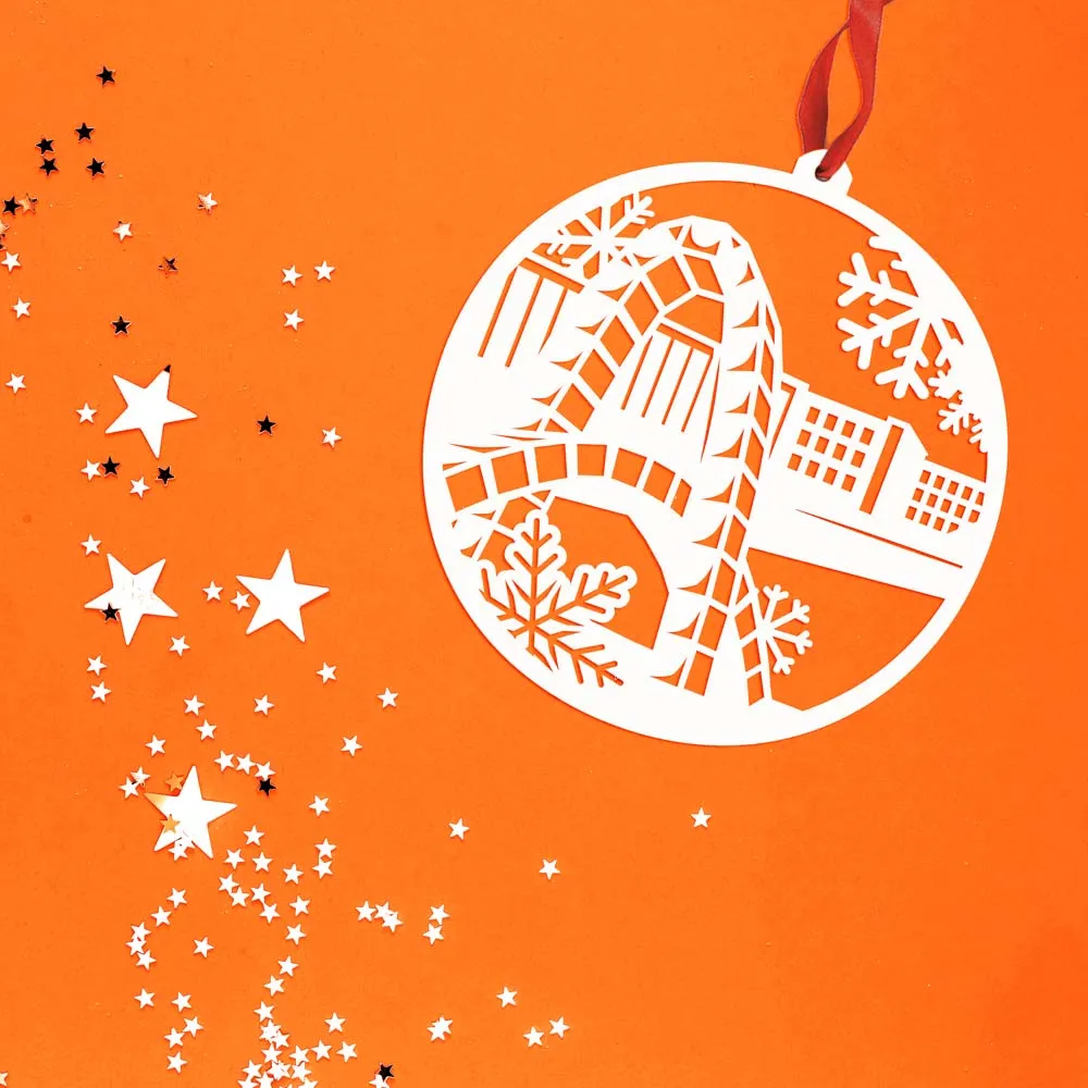 Apportez la magie du Havre à votre sapin avec cette boule de Noël en acier laqué blanc mettant à l’honneur le charme moderne de cette ville portuaire et de son emblématique arche du front de mer, parfaite pour sublimer votre décoration.