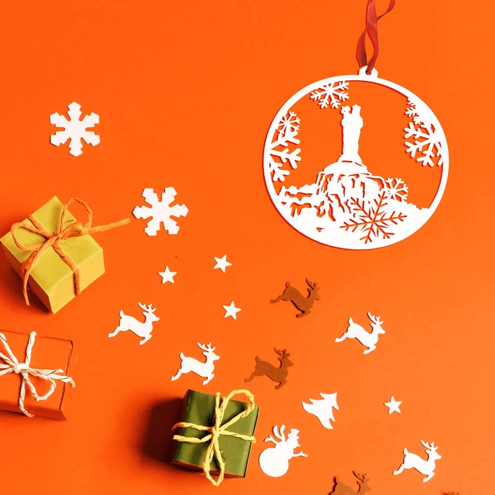 Apportez la magie du Puy-en-Velay à votre sapin avec cette boule de Noël en acier laqué blanc mettant à l’honneur le charme authentique de cette ville historique et de sa célèbre statue, parfaite pour sublimer votre décoration.