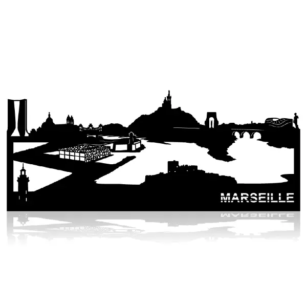 La skyline de Marseille en acier découpé au laser — Notre-Dame-de-la-Garde, Vieux-Port, fort Saint-Jean, Vélodrome. Ancienne collection ou micro-rayure invisible à distance.