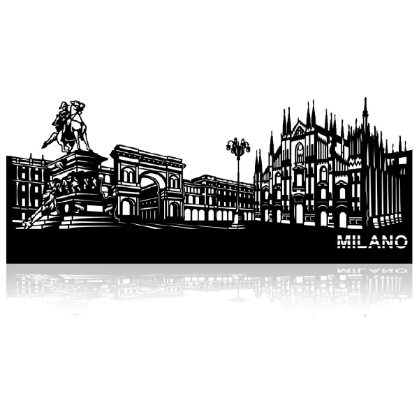 La skyline de Milan en acier découpé au laser — Duomo, Galleria Vittorio Emanuele. Ancienne collection ou micro-rayure invisible à distance. Laquage noir, fixation invisible, option LED. Formats L / XL.