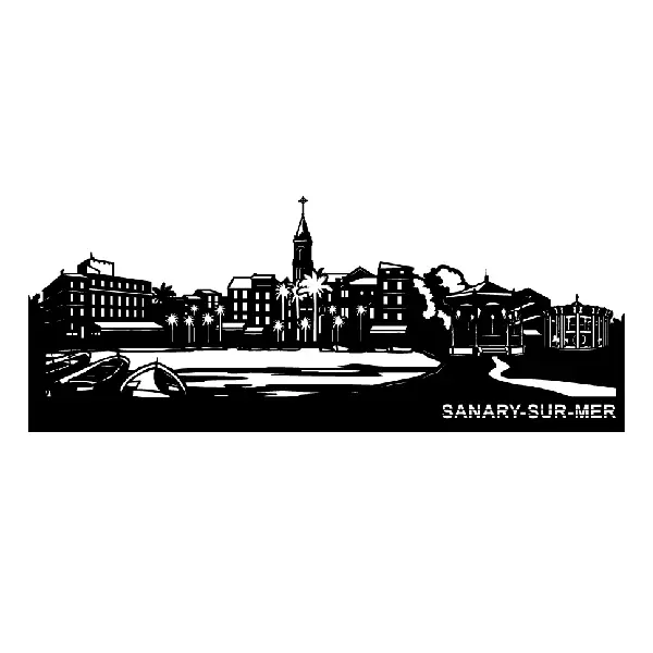 La skyline de Sanary-sur-Mer en acier découpé au laser. Port provençal, Hôtel de la Tour, Église Saint-Nazaire. Ancienne collection ou micro-rayure de surface. Laquage noir, fixation invisible, option LED. Formats M / L . Stock définitivement limité, sans réassort. Fabriqué en France.