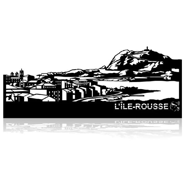 La skyline de l’Île Rousse en acier découpé au laser — îlot de la Pietra, phare, plages, maquis corse. Ancienne collection ou micro-rayure invisible à distance. Laquage noir, fixation invisible, option LED.