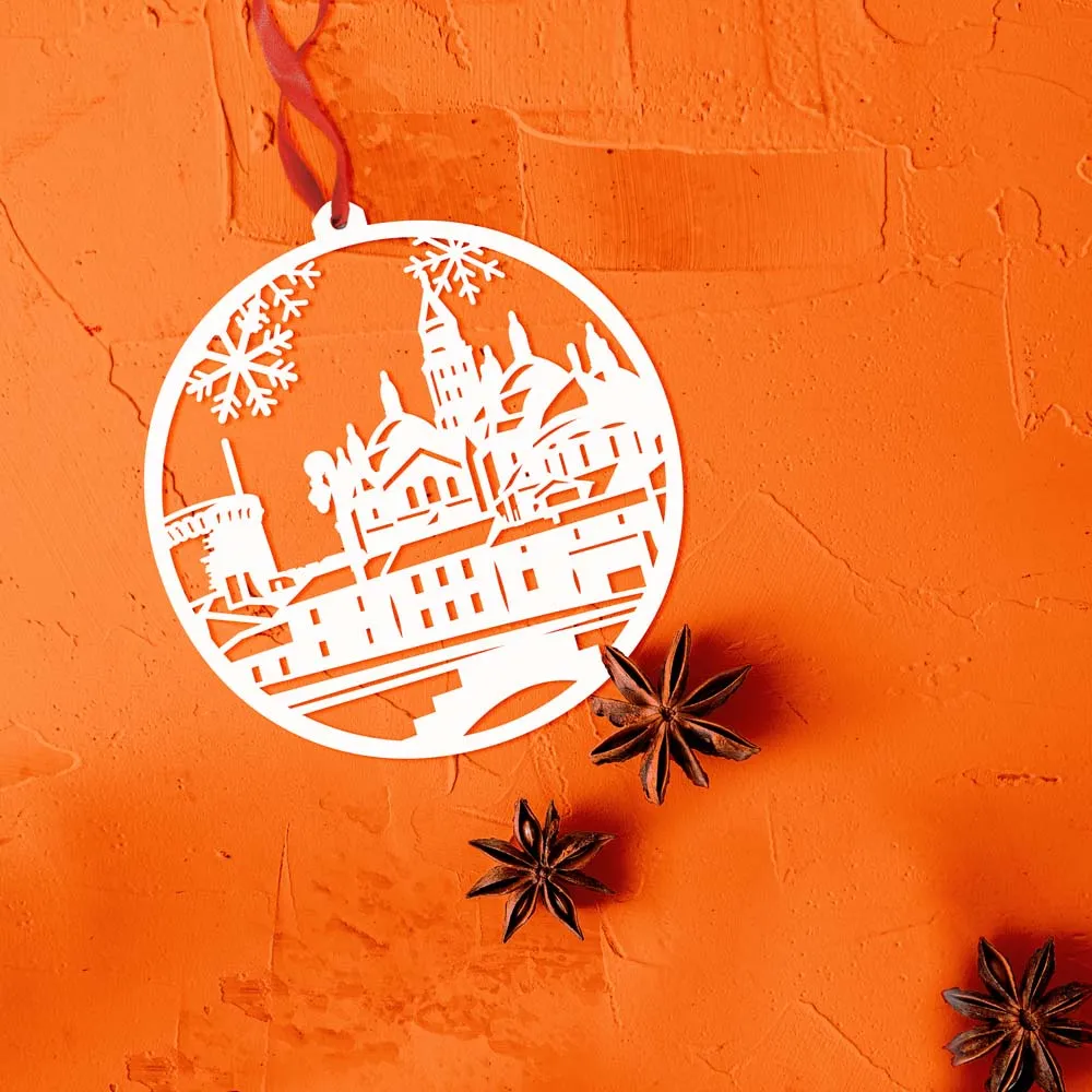 Avec son design finement découpé et son style moderne, cette boule de Noël symbolise le caractère unique de Périgueux, entre ruelles médiévales, monuments remarquables et art de vivre du Sud-Ouest. Parfaite pour ajouter une note patrimoniale et chaleureuse à votre sapin ou pour offrir un souvenir unique des fêtes au cœur du Périgord.